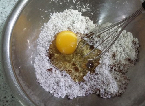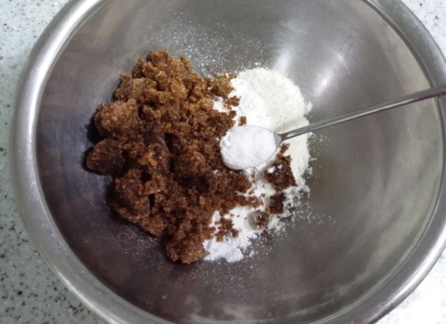 준비물; 박력분 40g, 흑설탕 80g, 베이킹파우더 4g(1찻숟가락), 초콜릿 100g, 버터 70g, 달걀 1개, 장식용 슈가파우더