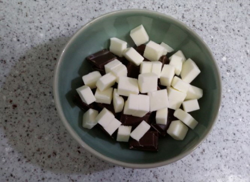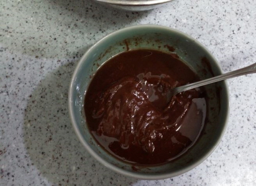 준비물; 박력분 40g, 흑설탕 80g, 베이킹파우더 4g(1찻숟가락), 초콜릿 100g, 버터 70g, 달걀 1개, 장식용 슈가파우더