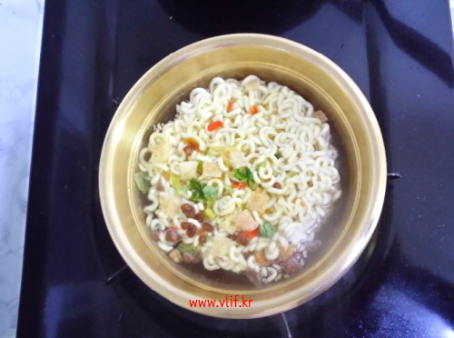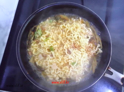 물 끓여 짜파게티 면과 건더기 스프 90%쯤 익히고