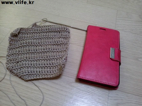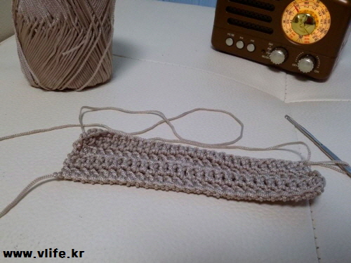 언니가 오래전 준 실인데 드디어 빛을 봐요. 30코 안되는, 손전화기 크기 맞게 사슬 떠서 한길긴뜨기 시작.