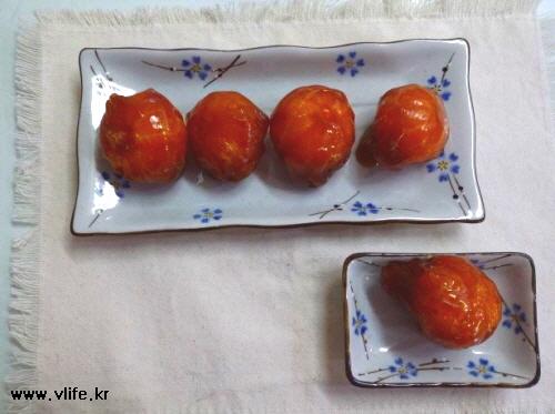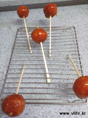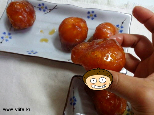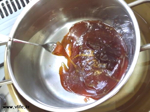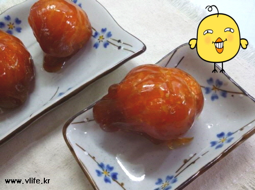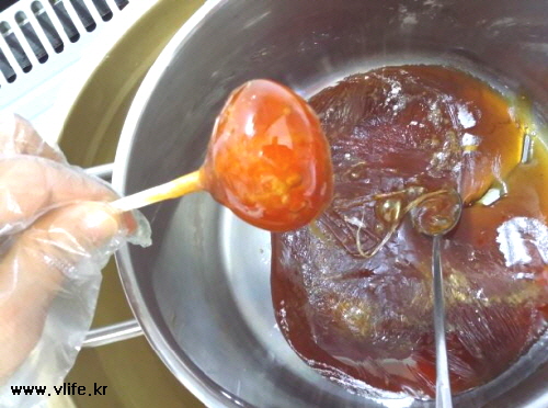 엿이 완전히 녹았을때 귤에 엿물 묻히기