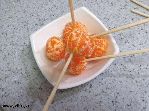 그동안 귤껍질 벗겨 가운데에 나무젓가락 꽂아 준비했어요.