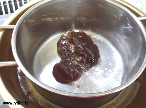 양푼의 물은 뜨겁게만 유지(식으면 가스불 켜서 잠깐 데우는 식으로)하고 뚜껑 덮어 두니 녹기 시작해요.