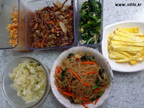 콩나물, 고사리, 시금치, 달걀지단, 잡채, 무나물