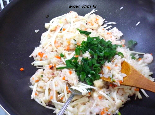 준비물; 밥, 팽이버섯, 새우, 당근, 파, 소금, 참기름, 깨소금, 올리브유