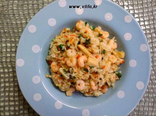 채 녹지 않은 새우를 넣었더니 밥이 조금 질어졌어요. 살짝 데쳐 넣을 걸 후회했어요.