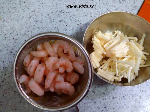 식감 대마왕 팽이버섯과 (작아서 아쉽지만) 탱글탱글 새우의 바람직한 만남입니다.