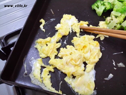 달걀 붓고 소금 조금 뿌려 볶다가 브로콜리와 섞어 잠시만 더 뒤적거리면 끝