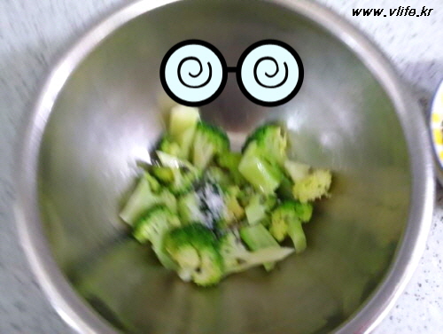 에구구구구~~ 흔들렸... 어지럽... 브로콜리 반 덜어 소금+참기름+깨소금 넣고 무쳐요.
