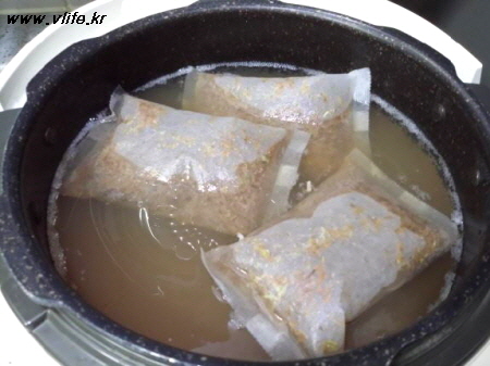 밥 1~2 공기에 3팩씩 넣고 물은 3리터 부으래요.