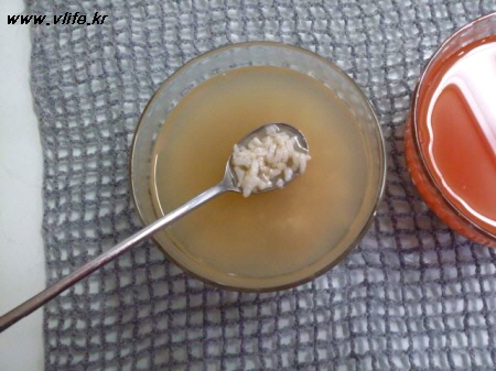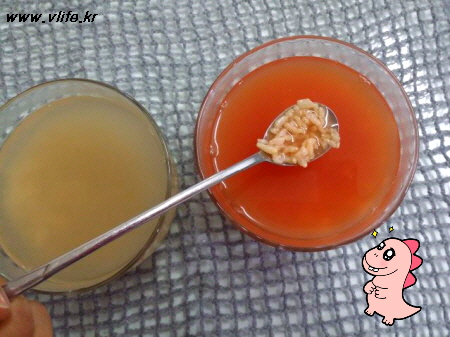 보이지는 않지만 밥알이 5~6개 떠있어요. 팩 살며시 건져 내고 식혜 반으로 나누어