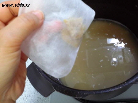 한쪽에는 비트 가루 팩 넣고 끓기 시작하면 색깔 상태 봐서 중간에 꺼내요.
