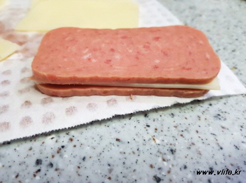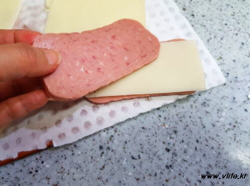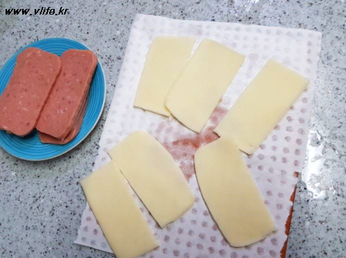 햄은 런천미트, 슬라이스 치즈를 반으로 자르니 크기가 거의 비슷해요.