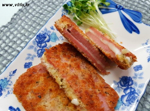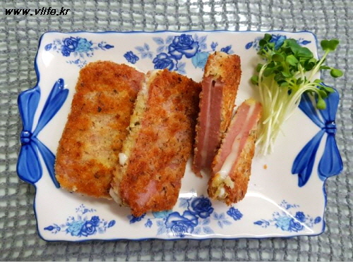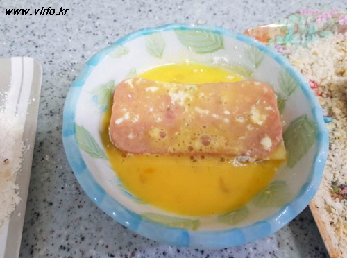 준비물; 햄 종류 아무거나, 슬라이스 피자 치즈, 밀가루, 달걀, 빵가루, 식용유
