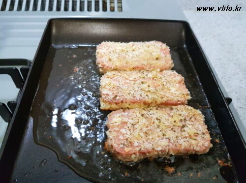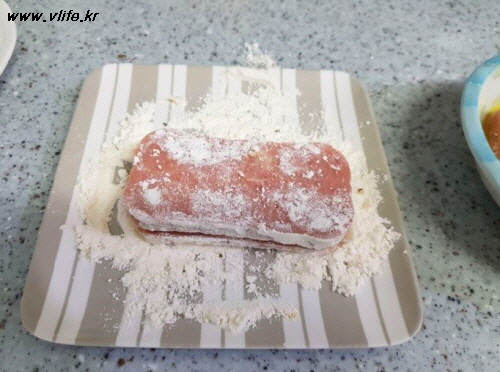 일단 오늘은 햄 가스 만들기로 했으니까 밀가루 묻혀 털어 내고