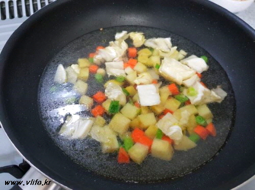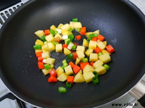 올리브유(식용유) 두르고 감자와 당근과 파 볶아요.