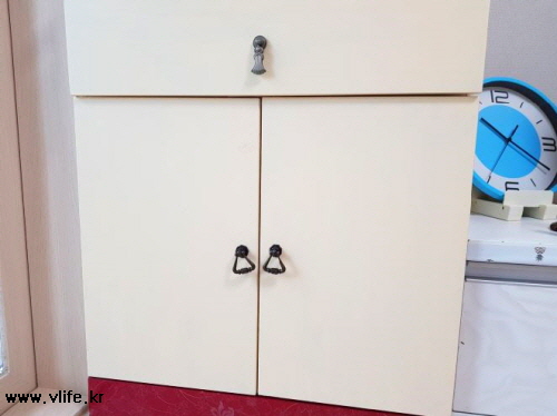 시트지 붙여 사용 중이던 수납장인데 내 실력의 부족함에 오래된 시트지 탓인지 가장자리가 떨어졌어요.