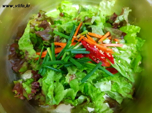 상추는 1.5cm 정도 넓이로 썰고 채소 모아