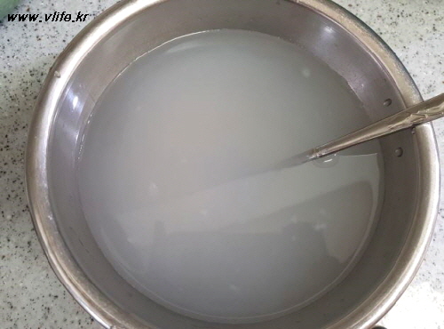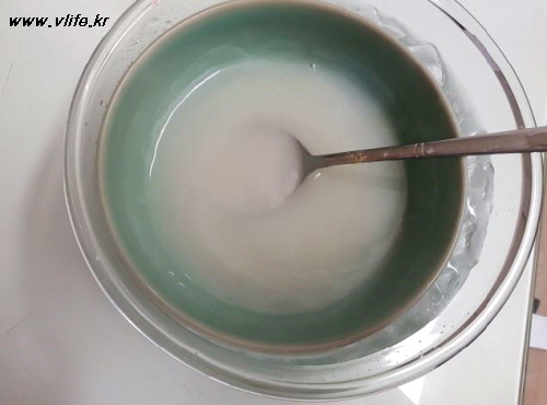 아주 묽게 물에 밀가루 풀어 전자레인지에 30여 초씩 저어가며 몇 번 돌려 간단하게 풀 쑤어 빨리 식으라고 얼음물에 담가 두었고요.