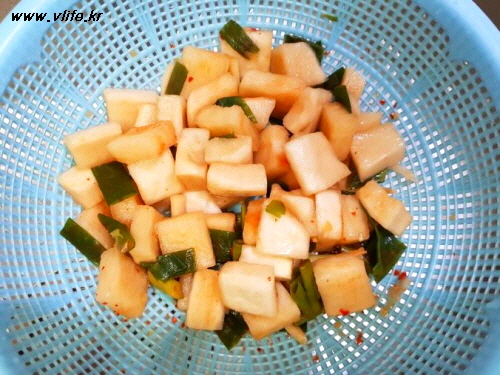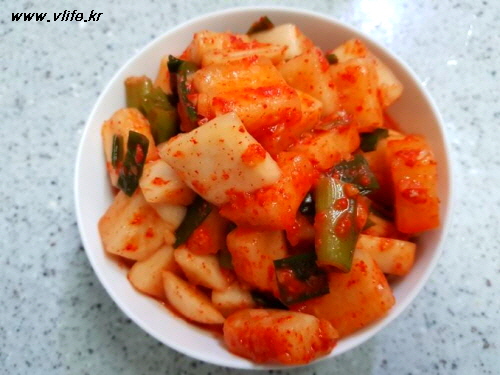 준비물; 푹 익은 깍두기, 마늘, 파, 설탕, 고추장, 깨소금, 참기름, 식용유