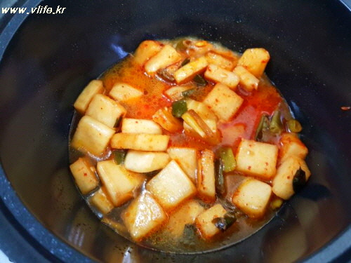 마늘, 설탕 조금, 고추장 넣고 섞어 또 뚜껑 덮어 두고 가끔 저어 주다가