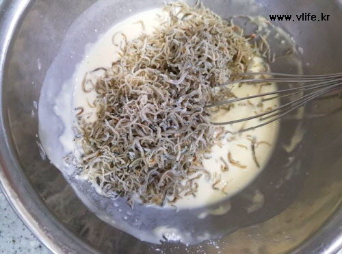 준비물; 잔멸치, 부침가루, 마늘, 청양고추, 식용유