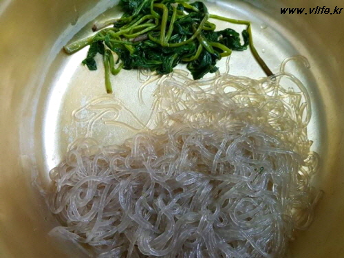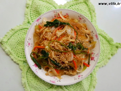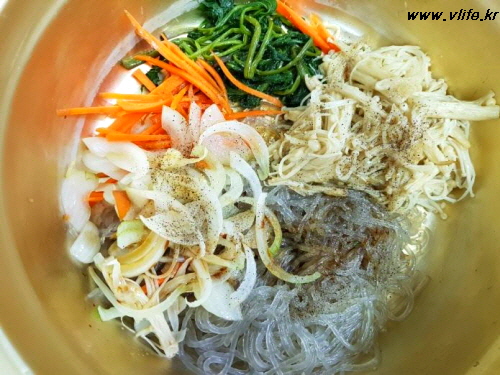 준비물; 당면, 팽이버섯, 당근, 양파, 신선초(시금치), 간장, 설탕, 참기름, 깨소금, 후춧가루, 소금, 식용유