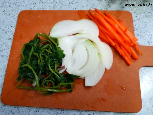 당근, 양파 채 썰고 신선초 나물, 혹은 시금치 등 파란 나물 준비(부추도 좋아요)