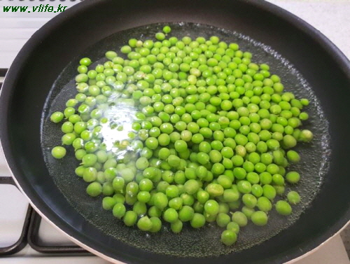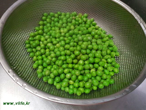 완두콩 500g을 씻어 모양 으깨지지 않을만큼 4~5분 삶아요.