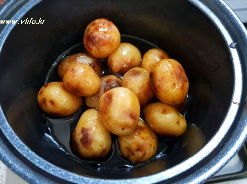 가끔 뒤섞어 주는데 감자가 익을수록 부서지기 쉬우니 조심해요.