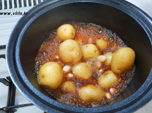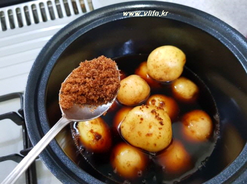 조림간장+물 +감자 넣고 색깔 진하라고 흑설탕(백설탕도 ok) 넣고 조리기 시작