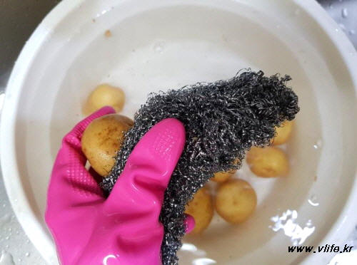 껍질채 먹는 거니까 철수세미를 사용해 문질러 닦고 여러 번 깨끗이 씻어요.