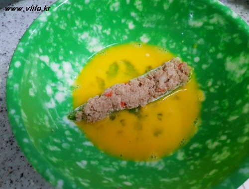 속재료와 달걀물 잘 붙도록 밀가루 발라 가볍게 털어 내고