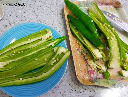 고추 반 갈라 내용물 많이 들어가게 씨 부분 잘라 냈고 다른 요리에 넣으려고 따로 잘 모아 두었어요.