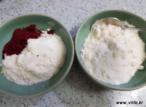 준비물; 찹쌀가루, 비트 가루, 소금, 설탕, 전분가루, 올리브유