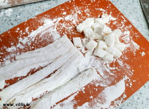 팥빙수 떡 크기로 잘라 전분가루 골고루 무쳐