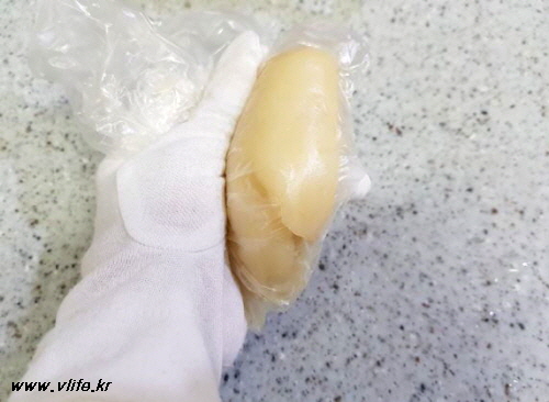 비닐봉지에 올리브유 조금 넣어 막 비벼 기름 바르고 떡 반죽 넣어 주물주물 찰기 있게 반죽해요.
