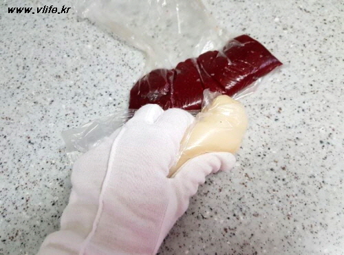 뜨거우니까 면 장갑 끼고 한참 주물거려(봉지 안 터지게 조심) 찰지게 반죽해서