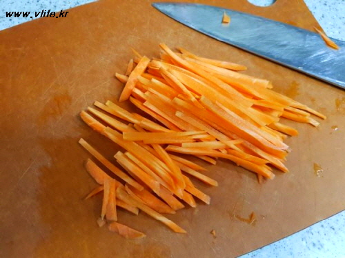 써는 방법도 칼로 채 썰거나, 채 칼 사용하거나, 감자칼로 얇게 저며 넓적하게 썰거나 마음대로~