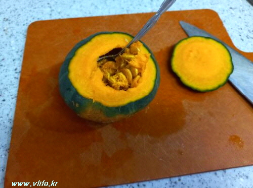 살짝 익은 단호박의 윗면 자르고 찻숟가락으로 속 긁어내고