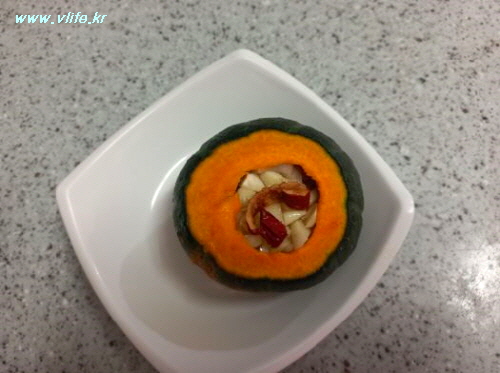 맛있는 단호박 속에 쫄깃한 찹쌀떡과 달콤한 꿀 마늘이 가득 들어 있어요.
