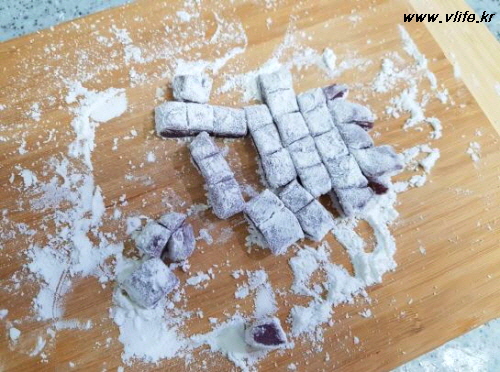 전분가루 발라 얇게 밀어 빙수용 떡 완성