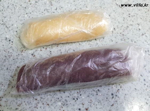 비닐봉지에 올리브유 조금 넣어 비벼 바르고 떡 반죽 넣어 조물조물 찰지도록 반죽해 식혀서