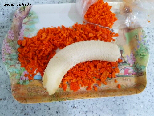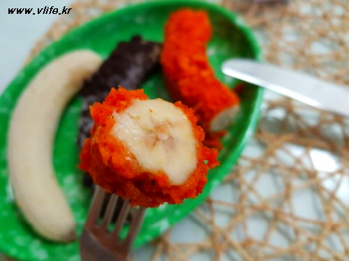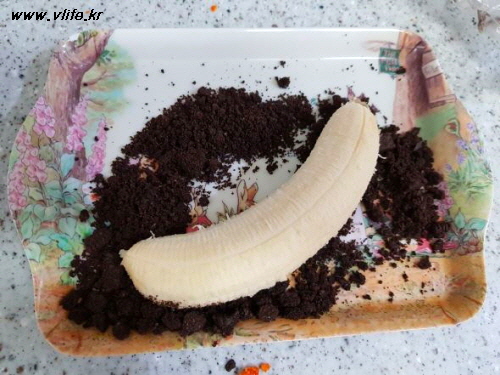 바나나에 과자 부스러기를 입히는데, 잘 안 입혀지는 것은 꾹꾹 눌러서 입혀야 되요.