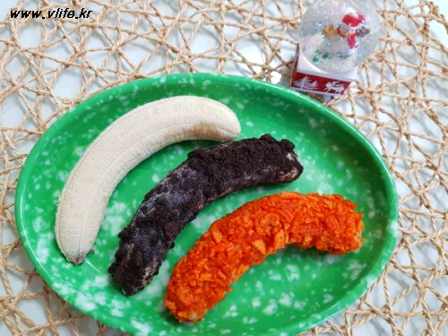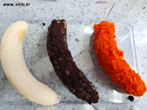 준비물; 바나나, 떡볶이맛 과자, 오레오