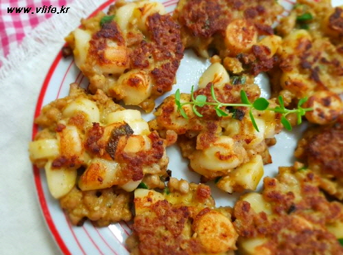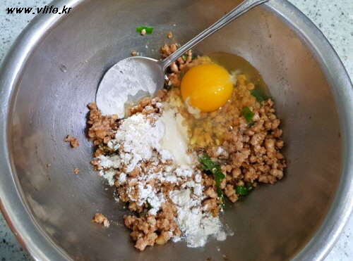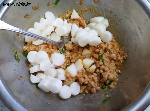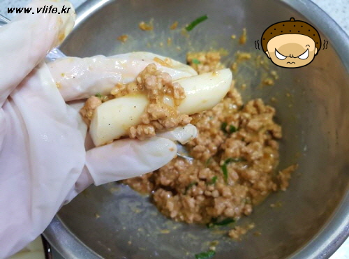 준비물; 간 돼지고기, 떡볶이 떡, 파, 마늘, 생강, 후추, 간장, 깨소금, 참기름, 물엿, 달걀, 부침가루(밀가루), 식용유