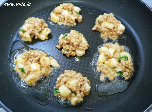익은 고기와 떡 때문에 도톰하게 부쳐져요.