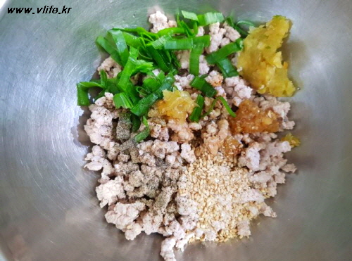 데친 고기에 파, 마늘, 생강 조금, 간장, 깨소금, 참기름, 물엿, 후추 넣고 반죽했는데 너어~~~~~무 고슬고슬해서 당황.