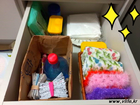 내용물; 길에서 받은 새 행주와 수세미, 주방용 손 수건, 무스비 전용&이쑤시개 담긴 스팸 캔, 베이킹 재료, 철 수세미, 찜 받침, 김치 할 때 만 쓰는 목 긴 일회용 장갑, 깔때기와 내가 만든 페트병 깔때기, 종이로 접은 뼈 상자, 몇 년 전에 귀여워서 산 휴대용 일회용 봉투 상자, 약초 물 만드는 거름망, 삼각 김밥 틀 등등