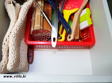 저는 새 티스푼, 포크 담아 둔 통을 안쪽에 눕혀 넣어 고정 시켰는데